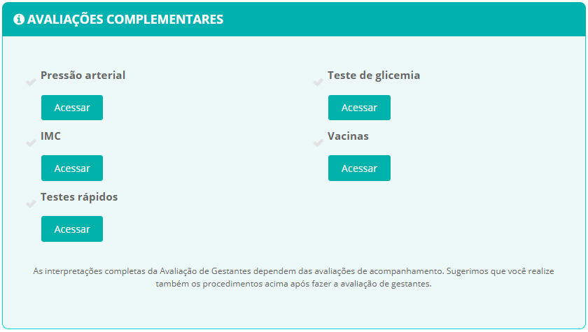 As interpretações completas do acompanhamento de gestantes dependem das avaliações complementares. Recomendamos que, após concluir a avaliação inicial, você também realize os procedimentos adicionais mencionados para um acompanhamento mais detalhado.