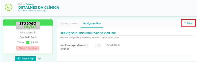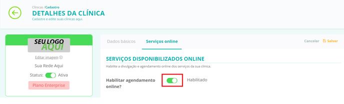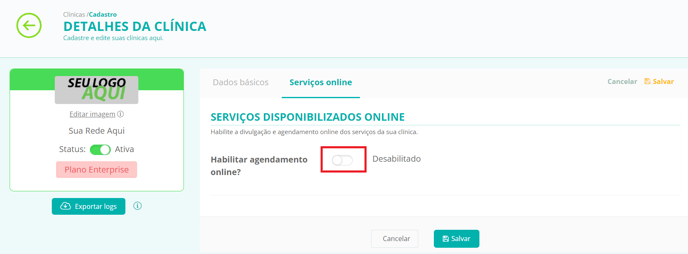 - Ao lado da frase "Habilitar agendamento online", clique no botão para habilitar: