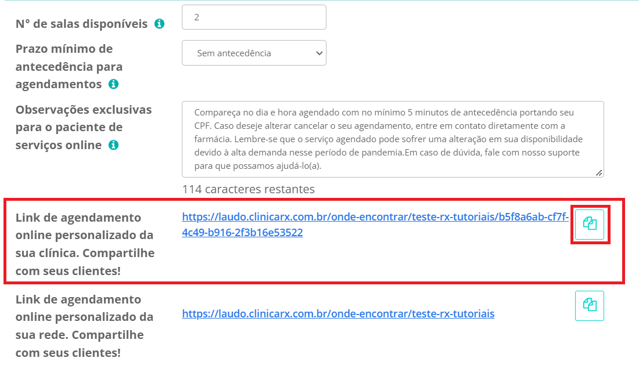 É um link que todo cliente recebe automaticamente ao contratar um plano pago da Clinicarx. Ele é útil para compartilhar com os clientes, para que eles possam fazer o agendamento de serviços na sua farmácia/consultório online e à distância. Também é uma forma de marketing.