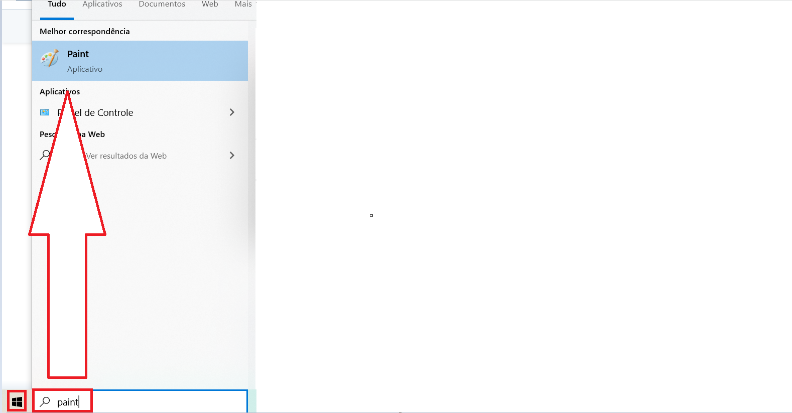 13. No Windows, clique na janelinha no canto inferior esquerdo da tela e digite na barra de busca "Paint". Em seguida, clique no programa "Paint":