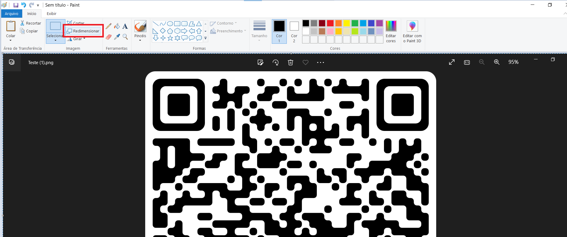11. Abra o arquivo do QR code que você salvou no seu computador. Provavelmente o QR code estará muito grande, então precisaremos dimensionar. Siga os passos abaixo para fazer o dimensionamento: