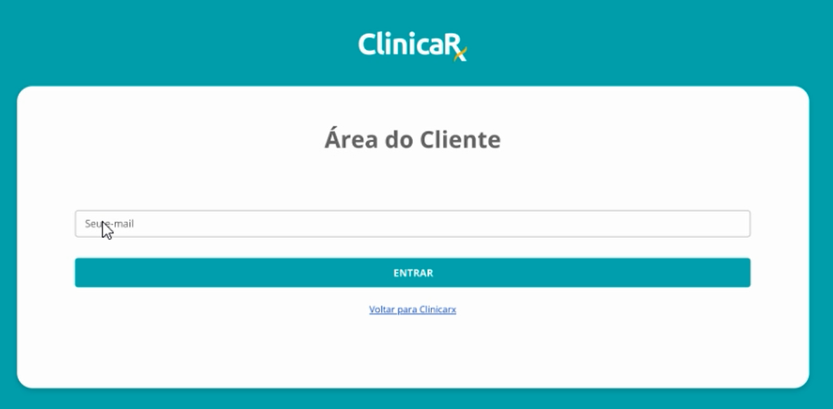 Caso o e-mail utilizado para acessar a plataforma Clinicarx seja diferente do cadastrado para acesso à Área do Cliente (financeira), você será direcionado para a página abaixo, onde deverá informar o e-mail correto — o mesmo informado no momento da contratação — para garantir o acesso à Área Financeira: