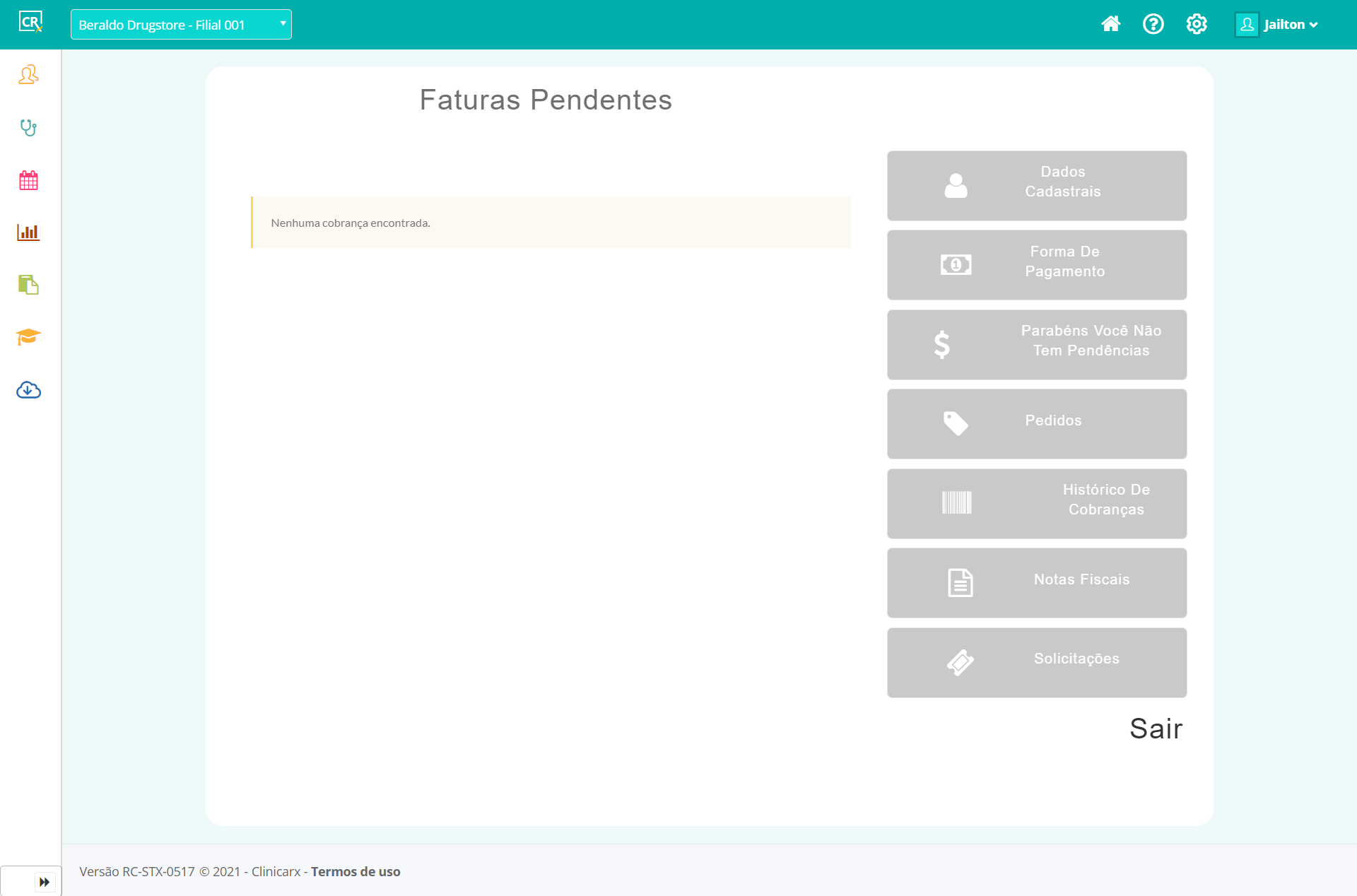 Com o perfil Administrador, é possível acessar a Área do Cliente (financeira) e consultar informações financeiras diretamente pela Plataforma Clinicarx.
