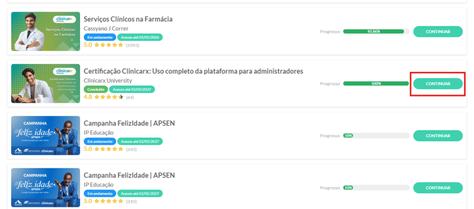 Importante: Verifique se o curso que você deseja acessar está 100% concluído. Se estiver, siga os próximos passos: