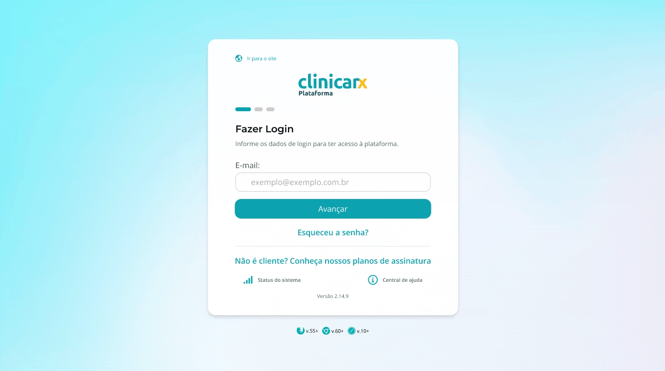 Para acessar a plataforma Clinicarx, primeiro acesse o link: http://app.clinicarx.com.br/