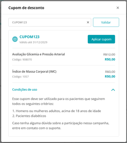 Confira os serviços associados e as condições de uso. Em seguida, clique em Aplicar Cupom. Os serviços e os descontos do cupom serão automaticamente associados ao atendimento.