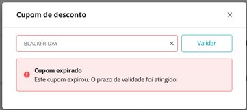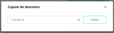 Ao clicar em Aplicar Cupom, será exibida a tela para inserção do código do cupom e validação desse código. Insira o código do cupom e clique em Validar
