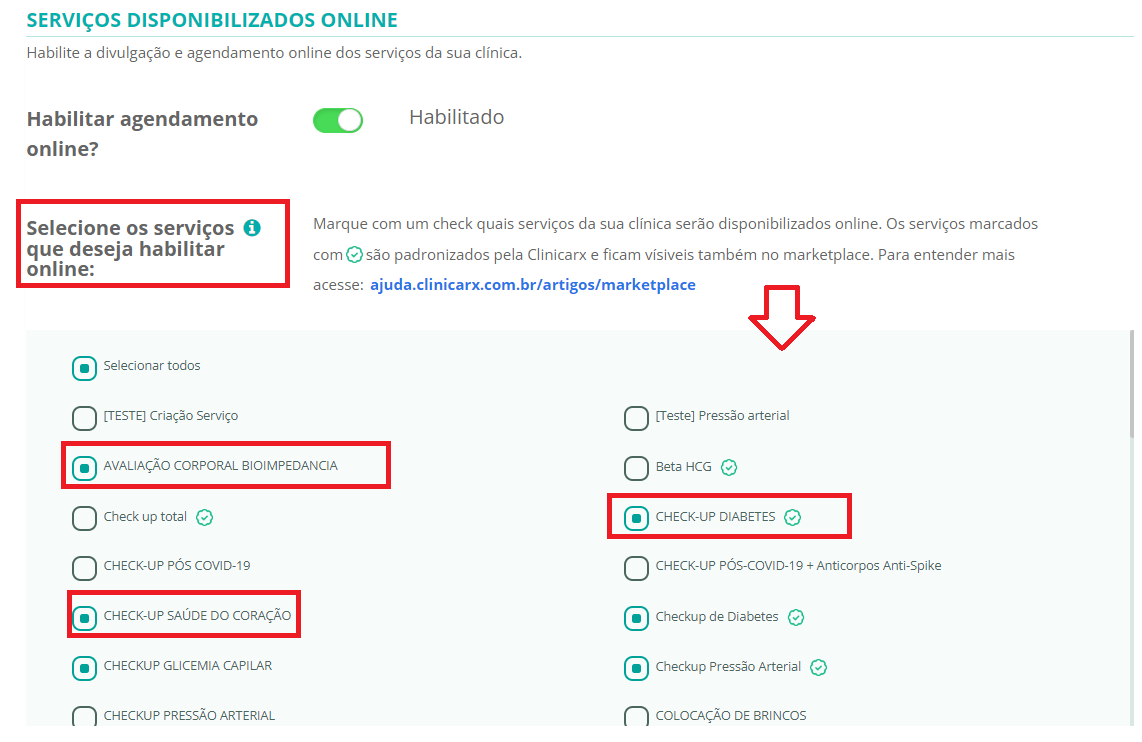 1. Ao habilitar o Agendamento Online, o botão ficará verde e você poderá escolher quais serviços deseja disponibilizar para seus pacientes visualizarem e agendarem: