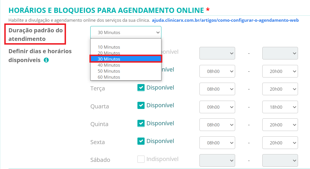 1. Em "Horários e bloqueios para agendamento online", configure a "Duração padrão do atendimento". Ou seja, quanto tempo em média você leva para atender um paciente? Selecione a opção mais adequada à sua realidade: