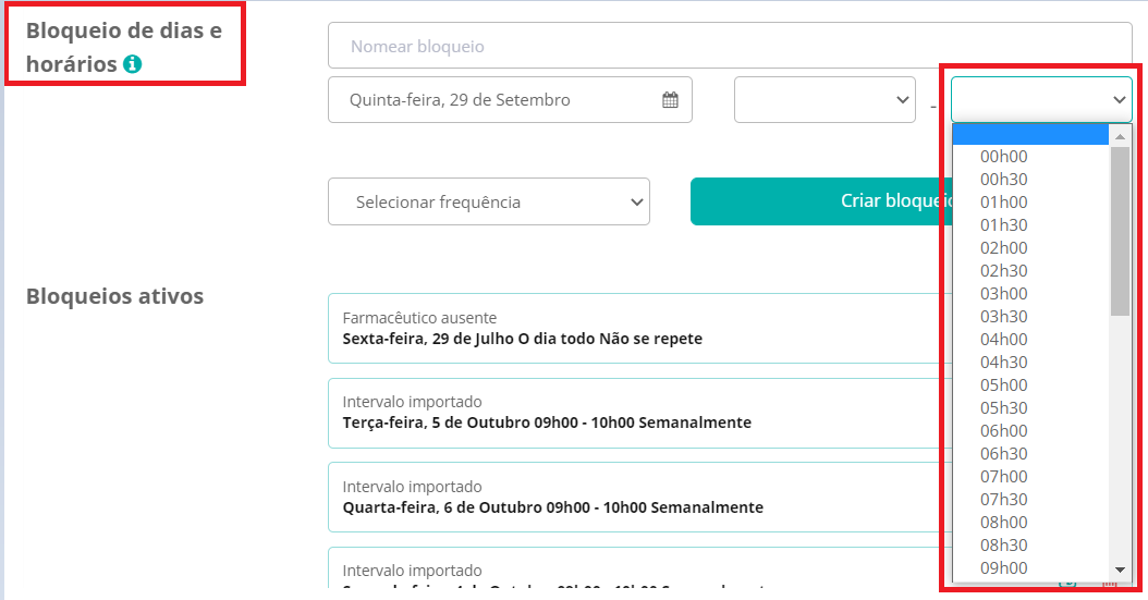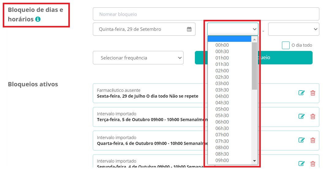 - Agendamento no horário de almoço do farmacêutico, porque não foi configurado o bloqueio para esse período.