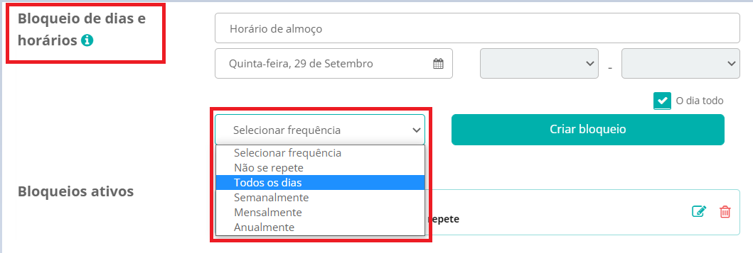 b) "Todos os dias" (bloqueará todos os dias no horário que você definiu, a partir da data que você selecionou anteriormente - por exemplo, para horário de almoço e intervalo);
