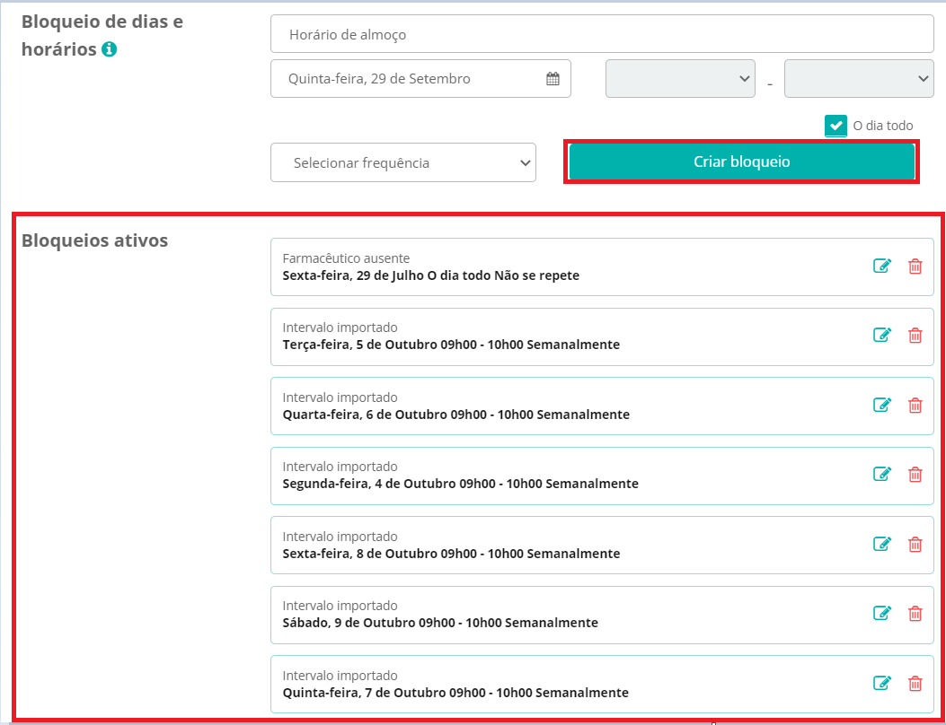 Perceba que você pode editar (no ícone azul) ou excluir (no ícone de lixeira vermelha) cada um dos bloqueios criados.
