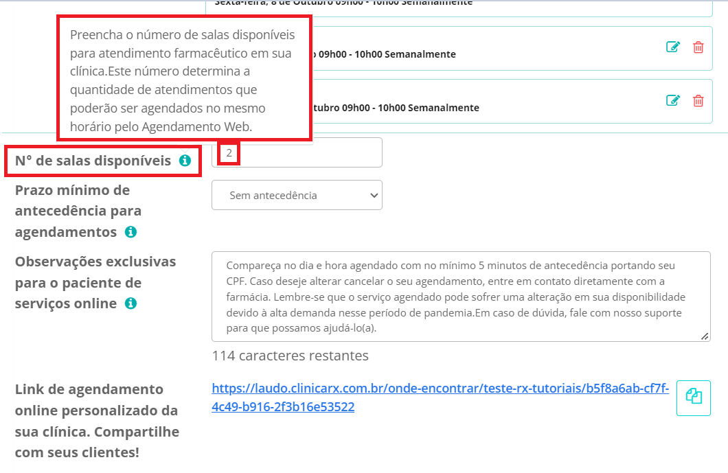 Importante: A configuração deve ser feita por clínica, pois cada unidade pode ter horários, dias de atendimento e intervalos diferentes.