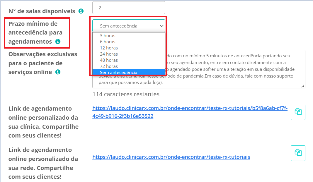 11. Defina o prazo de antecedência para agendamentos, ou seja, a partir de quantas horas de antecedência o seu paciente poderá marcar o agendamento na sua loja: