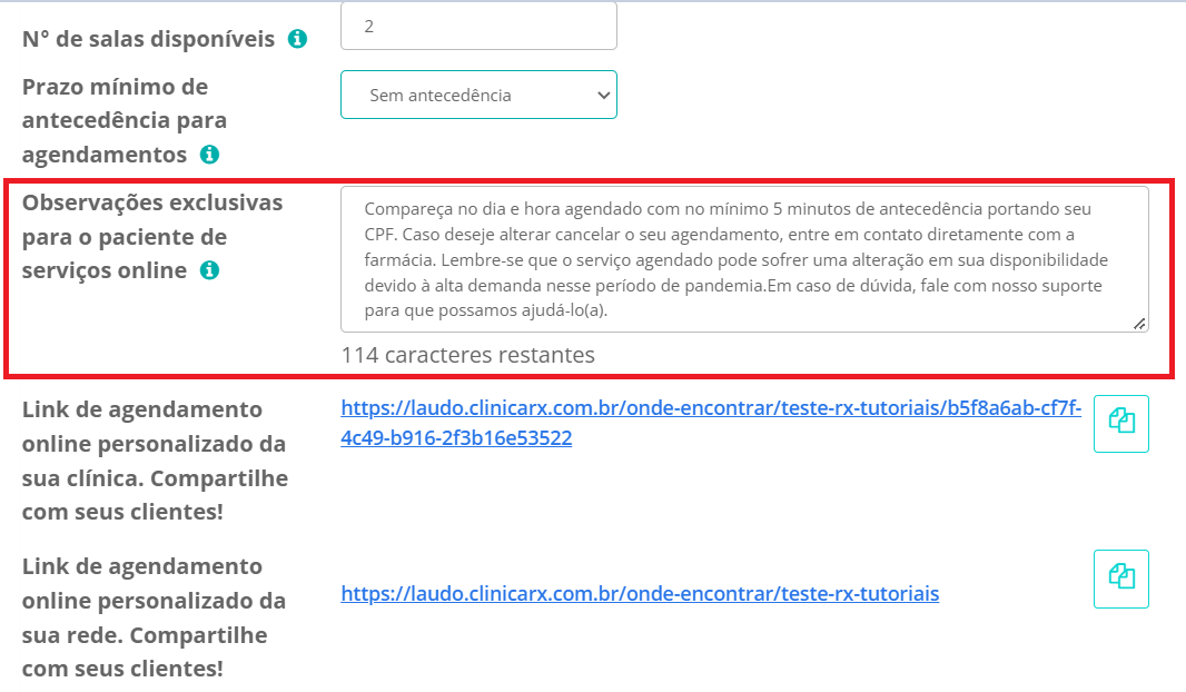 ⚠️ Importante: Verifique todos os campos obrigatórios na aba de dados básicos da sua clínica e na aba de serviços online. Caso algum campo obrigatório não esteja preenchido em uma dessas abas, a confirmação de salvamento não será realizada.