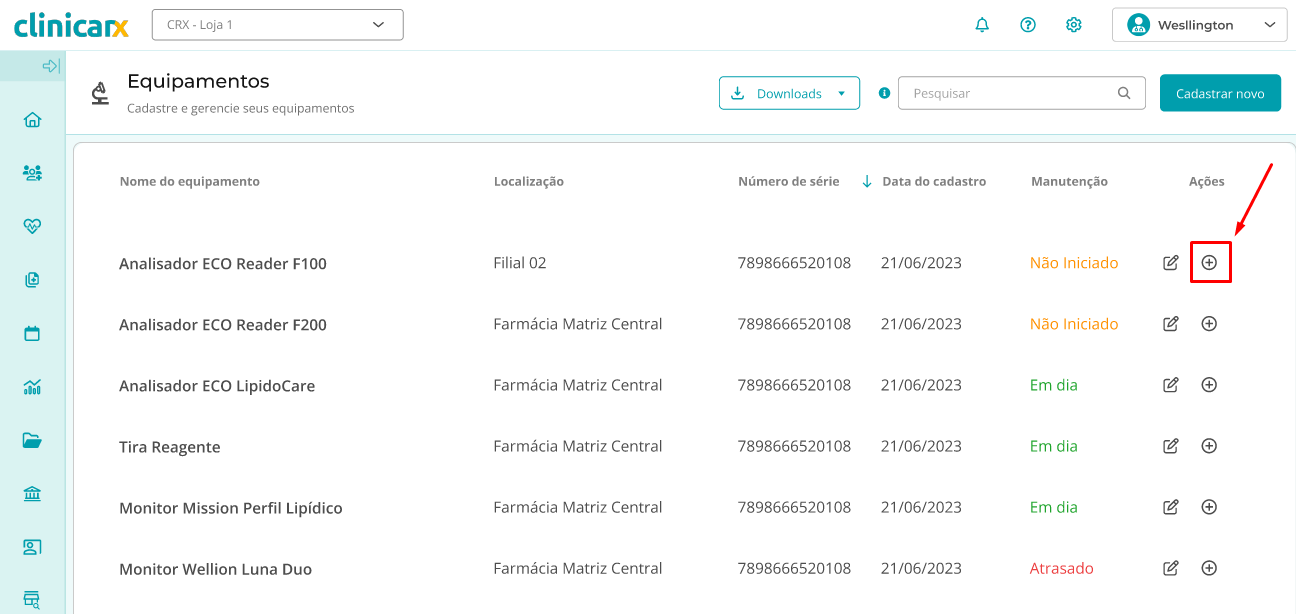 - Busque pelo número de série, nome ou localização do equipamento cadastrado que deseja consultar. Ao encontrá-lo, clique sobre ele;