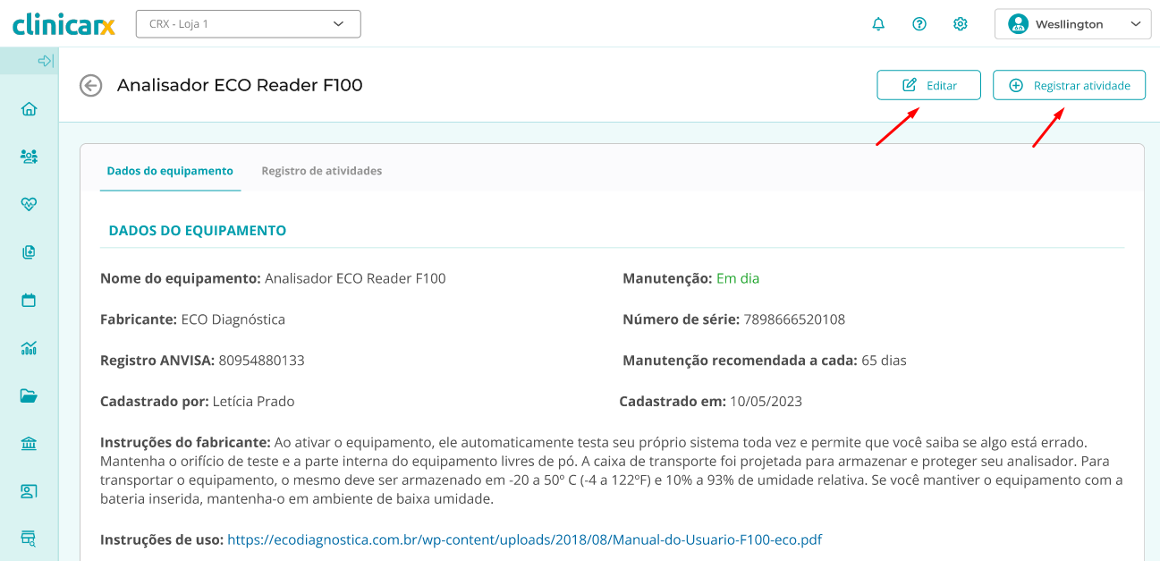 - Ainda para um equipamento já cadastrado, é possível acessar os detalhes desse equipamento e selecionar a opção Editar ou Registrar Atividade dentro dos detalhes do equipamento: