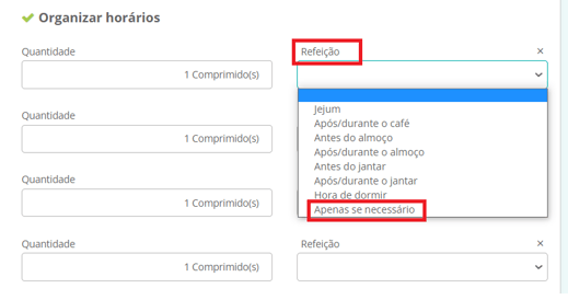 8. Em "Organizar horários" e "Refeição", você pode vincular com refeições ou marcar "apenas se necessário":