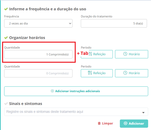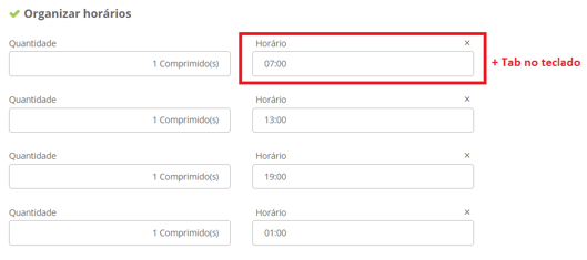 Dica 1: para formas farmacêuticas sólidas normalmente você vai colocar o número "1" e apertar a tecla do teclado "Tab", para preencher automaticamente o restante dos horários com "1" também. A não ser que o paciente precise tomar mais de uma dose por vez;