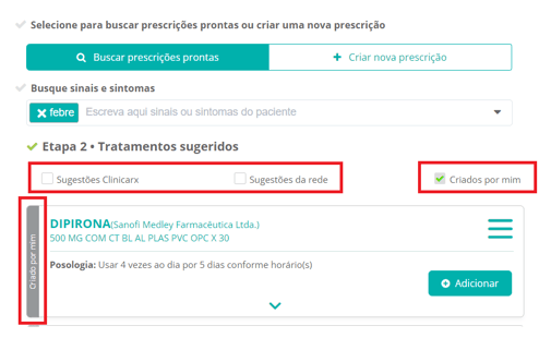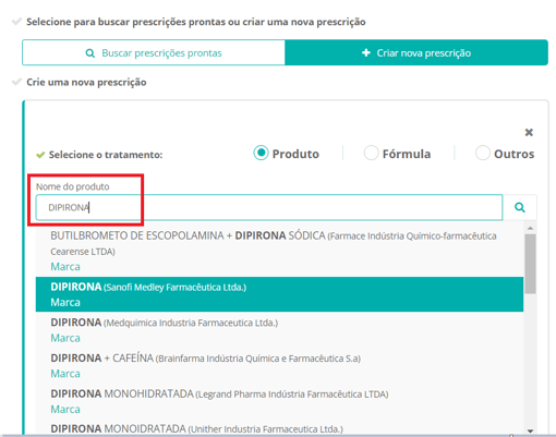 Você pode prescrever pelas sugestões Clinicarx (SmartRx) ou criar uma prescrição própria, buscando pelo nome comercial ou genérico do produto.