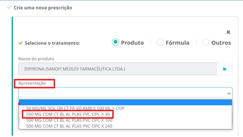 4. Selecione a apresentação correta. As apresentações são apresentadas conforme tabela da Anvisa: