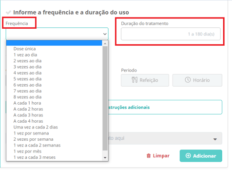 6. Informe a frequência (quantas vezes por dia o paciente vai utilizar) e duração do tratamento (por quantos dias o paciente vai utilizar):