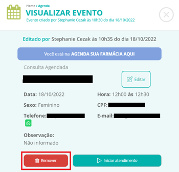 4. Para excluir o agendamento, clique sobre ele e depois no botão "Remover":