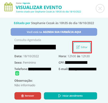 Observação: Aqui não será possível editar nome completo, CPF, data de nascimento ou sexo, pois esta funcionalidade é destinada apenas à edição dos dados do agendamento.