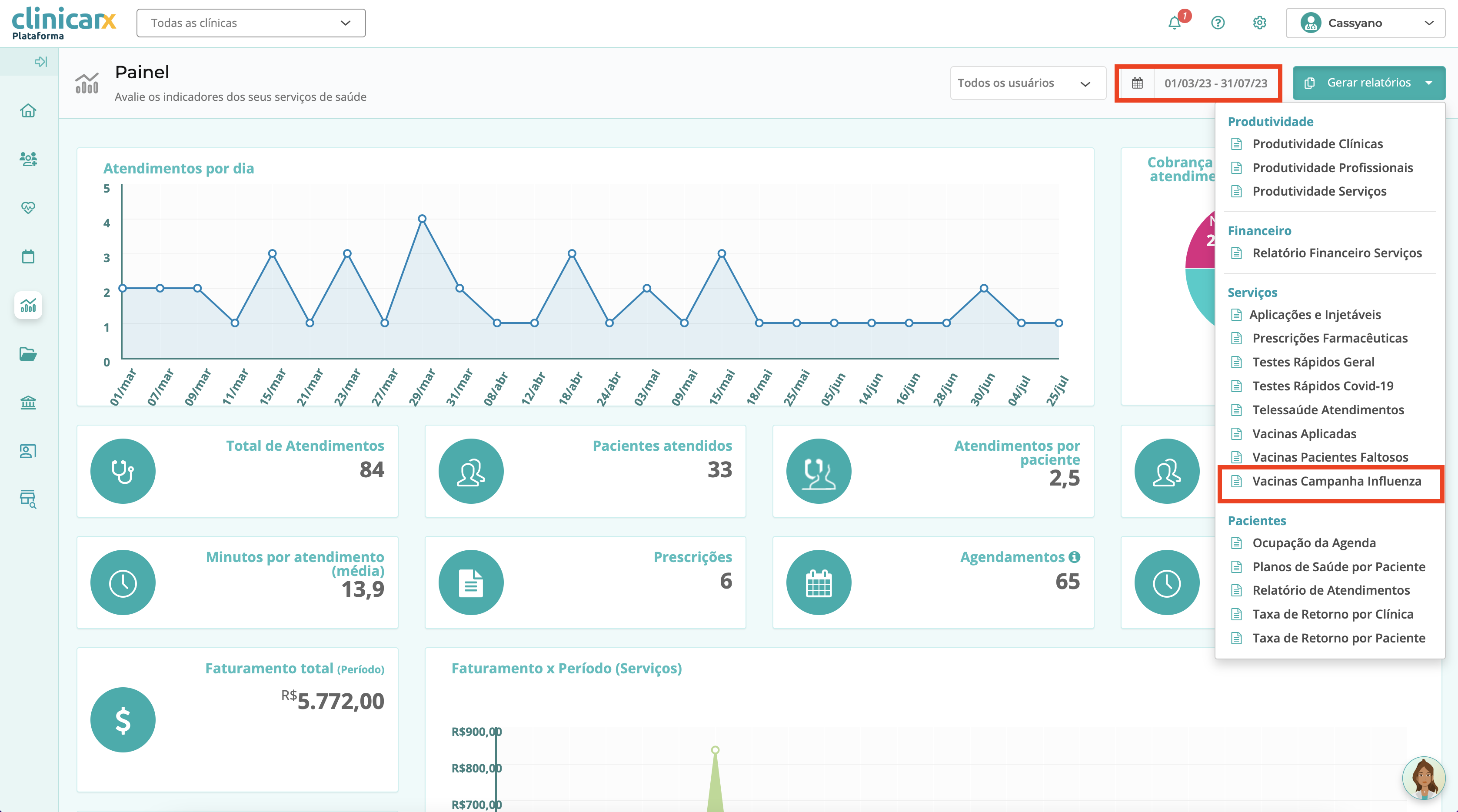 no menu lateral esquerdo; - Defina os filtros, selecione: A clínica desejada (ou todas as clínicas) e o período de tempo (caso deseje emitir um relatório com intervalo superior a 180 dias, entre em contato com o suporte Clinicarx);