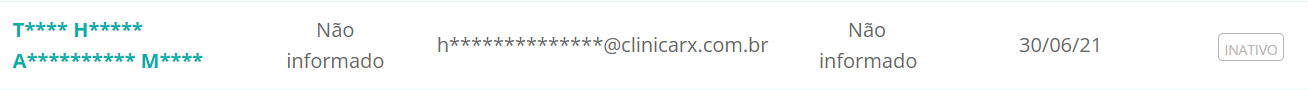 Perceba que, ao invés do nome do paciente, aparecerão somente as iniciais do nome e o restante será preenchido com asteriscos. O mesmo serve para o e-mail. Não teremos mais acesso nem à idade e nem ao CPF, apenas à data do último atendimento: