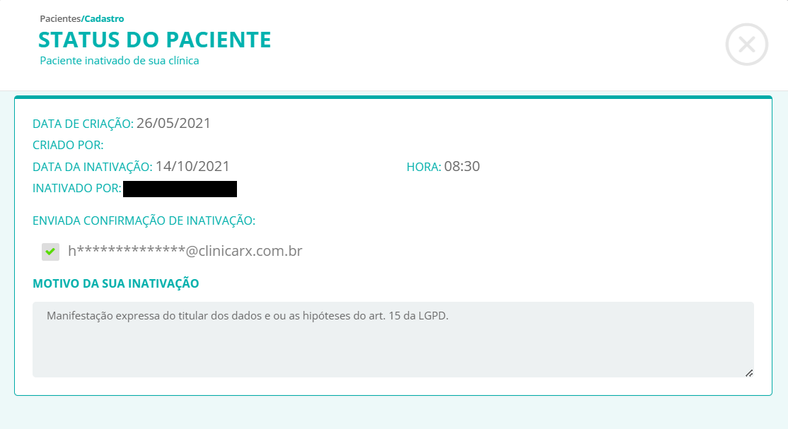 Pronto! Você verificará através de um pop-up a confirmação do procedimento de inativação do paciente realizada. Em até 2 horas o paciente ou contato receberá a confirmação via e-mail da inativação do paciente pela plataforma para segurança e privacidade do mesmo.