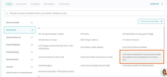 Inicie o atendimento da paciente, clique em "Anamneses" e selecione a opção "Anamnese e avaliação de risco para prescrição farmacêutica de contraceptivos hormonais (CH)" ou pesquise pela anamnese na barra de busca: