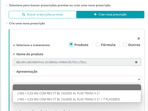 - Caso queira utilizar uma prescrição já pronta, no procedimento de prescrição, clique em "Buscar prescrições prontas", e preencha o sinal ou sintoma anteriormente cadastrado a um medicamento contraceptivo hormonal: