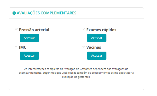 As interpretações completas do acompanhamento de gestantes dependem das avaliações complementares. Recomendamos que, após concluir a avaliação inicial, você também realize os procedimentos adicionais mencionados para um acompanhamento mais detalhado.