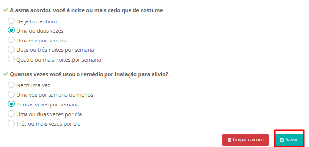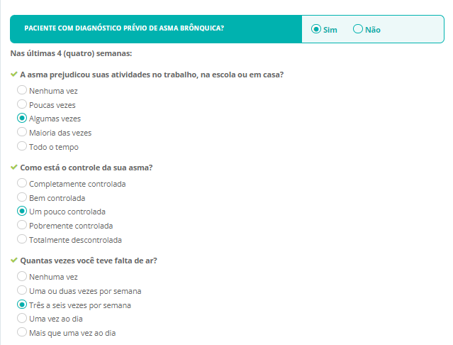 Se o seu paciente possui J45 - Asma adicionada como condição clínica no perfil, o Clinicarx atribuirá uma resposta SIM automaticamente;