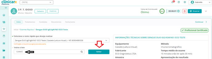 - Agora informe o Número do lote do teste que utilizará para a realização do exame e clique em ''Validar'':