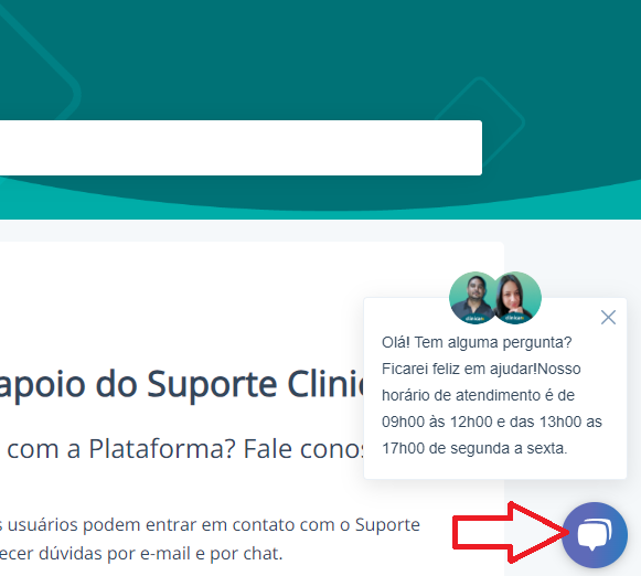 - Suporte via Chat: Fale com atendente usando o chat disponível no canto inferior direito aqui na Central de Ajuda! (https://ajuda.clinicarx.com.br/artigos) Para acessar a central de ajuda na plataforma, basta clicar sobre o ponto de interrogação