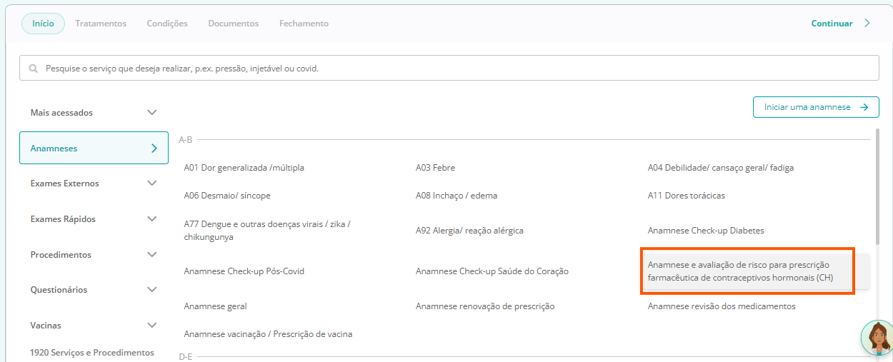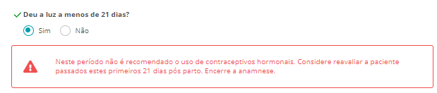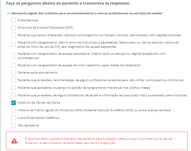 Inicie o preenchimento das questões conforme a exibição delas. De acordo com as respostas informadas pela paciente, a anamnese poderá ser interrompida, caso não haja recomendação para a realização da prescrição do contraceptivo hormonal: