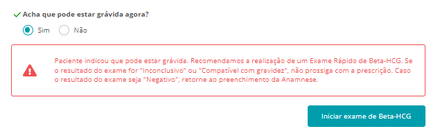 - No caso da paciente apresentar sintomas de gravidez, ou ter suspeita, será indicado a realização de um exame rápido de Beta-HCG: