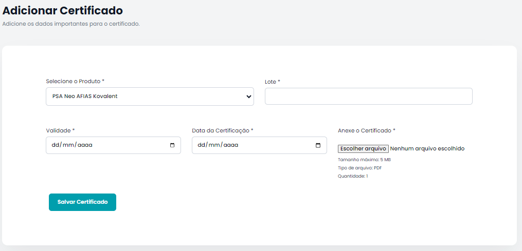 Selecione o Produto: Uma lista que contém todos os produtos disponíveis para cadastro. Selecione para qual produto deseja cadastrar o certificado;