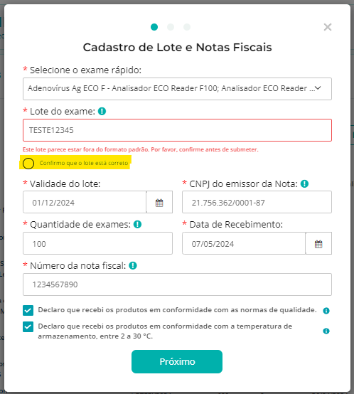 - Caso o formato do número do lote precise ser confirmado, aparecerá uma mensagem ao clicar em "Próximo". Confira o lote digitado e clique em "Confirmo que o lote está correto". Essa validação ocorre apenas para auxiliar o usuário a revisar os números cadastrados e é solicitada como forma de segurança para que não ocorram problemas no momento de cadastro.