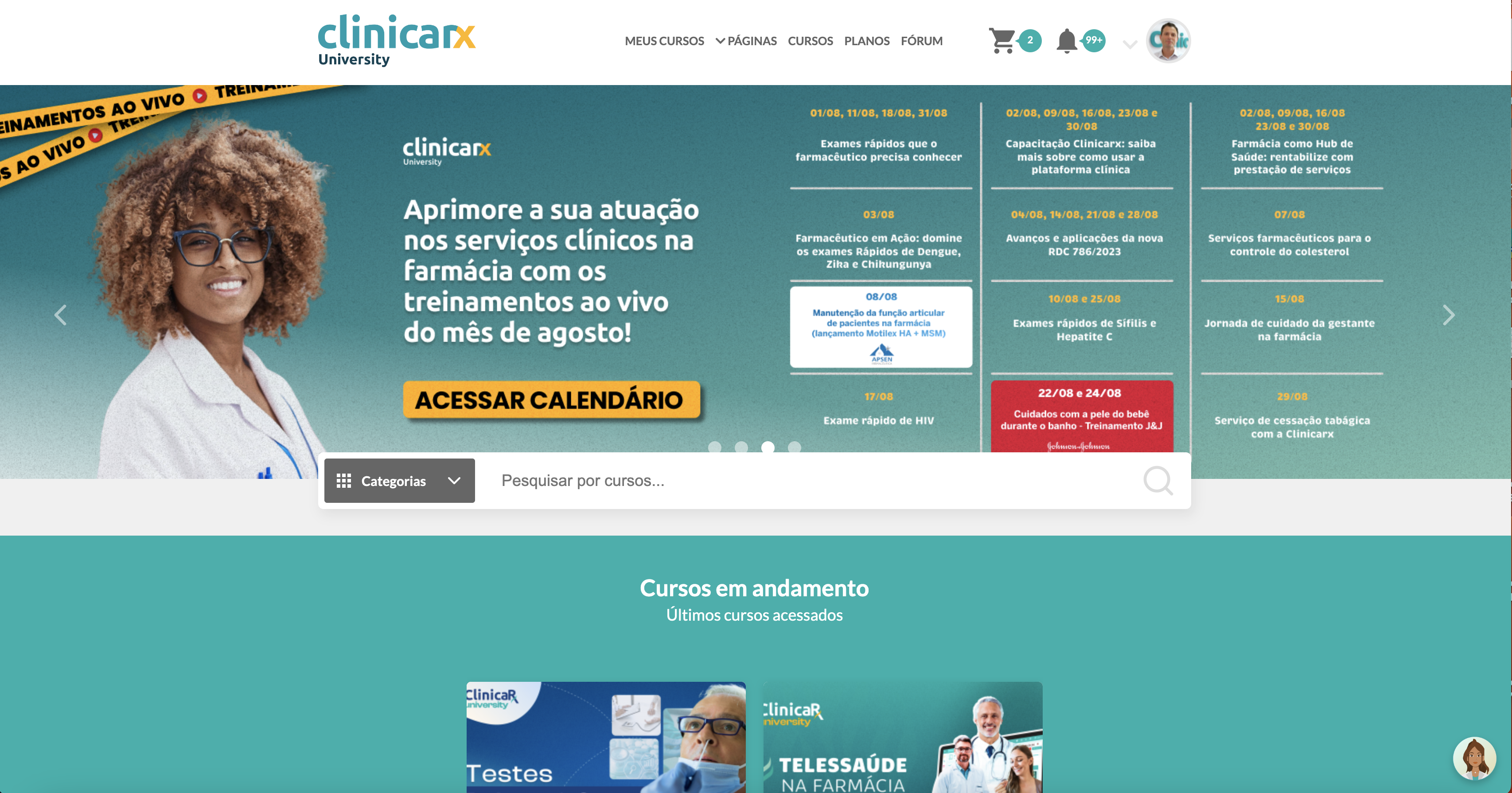 - Todos os assinantes da Clinicarx têm acesso aos cursos gratuitos e descontos especiais nos cursos pagos;