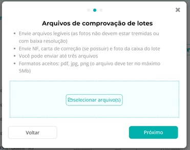 Após confirmar todos os dados, clique no botão "Próximo". Nessa nova etapa você poderá anexar até 3 imagens (Ex: Nota Fiscal, Foto da Caixa, Carta de Correção caso se aplique). Após realizar o upload dos arquivos, clique novamente em "Próximo":
