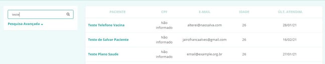 2. Na barra de "Busca", no canto superior esquerdo, escreva o CPF ou nome do paciente. Caso não consiga encontrar o paciente você poderá clicar em "Pesquisa avançada" e preencher com outras informações relevantes para facilitar a busca: