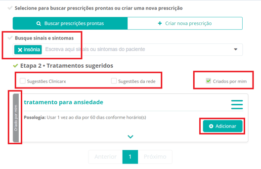 13. Para procurá-la, você deve clicar em "Buscar prescrições prontas", digitar um dos sintomas criados pelas tags no campo "Busque sinais e sintomas" e desmarcar a opção "Sugestões Clinicarx" e, se necessário, "Sugestões da rede". Depois, clique em "Adicionar":