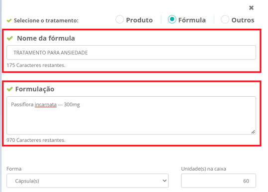 3. Crie um nome para a fórmula no campo "ESCREVA AQUI O NOME DA FÓRMULA". Depois, digite a "Formulação" - campo livre para escrever princípios ativos, dosagem de cada componente, etc: