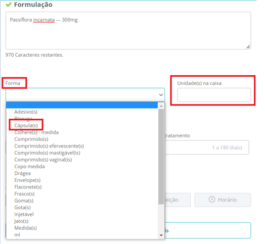 4. Selecione a Forma Farmacêutica e a quantidade de unidades na caixa (unidades para sólidos ou doses para líquidos):