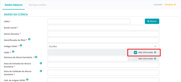 Atenção: Se sua clínica ainda estiver em processo de obtenção do CNES ou do alvará, ela estará irregular e poderá sofrer sanções. Enquanto isso, para conseguir salvar alterações nesta página, utilize a opção "Não informar".